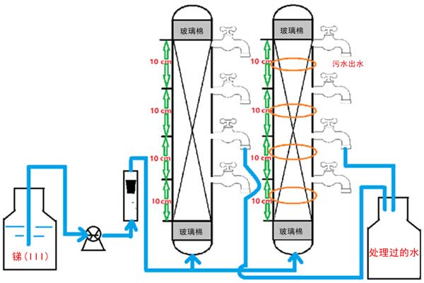 我們進行了色譜柱實驗,以了解弱磁場是否可用于提高連續流動系統中納米級零價鐵的反應性。設置了兩個平行的連續柱系統,內徑為10mm(外徑=14mm),高度為200mm,如圖1所示。一個柱系統有一系列環形永磁體,最大磁場通量強度約為1800Gs(材料:釹鐵硼),每5.0厘米放置一個環形磁鐵。聚甲基丙烯酸甲酯柱填充有10g鐵與活性炭(10-20目)的混合物。柱的兩端用一小塊玻璃棉塞住。圖1描述了色譜柱組件和與之配套的實驗設計。測試是在25±1℃下完成的。為了獲得合適的流速,使用了蠕動泵。銻(III)離子溶液通過鐵改性活性炭床向上轉移,以確保床完全飽和。為了評估銻(III)吸附去除情況,定期采集流出物樣品。
