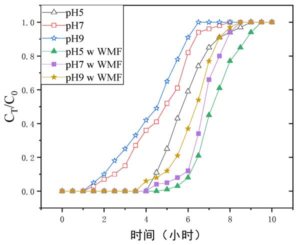吸附介質pH值是調節吸附能力的最關鍵因素。吸附劑吸附位點中的物質與溶液之間相互作用(物理化學)的性質反映在吸附介質的初始pH值上,這與從水吸附到吸附劑表面的機理有關。在保持相同流速、床高和初始濃度的情況下,研究了不同pH水平(pH5至pH9)下pH對穿透時間的影響。