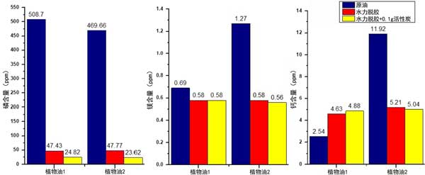磷含量在兩個兩種植物油中主要由以所示的處理(水重量2%+活性炭0.1克)后減少圖2。植物油1的磷含量降低了大約95.22%,而植物油2的磷含量降低了大約相同的值(94.98%)。油液經水脫膠后Mg、Ca含量略有下降,而Ca處理后略有升高。這一結果可能是由于在處理過程中活性炭中存在一些Ca解離回油相。活性炭對磷含量的大量降低是由于NaOH改性的活性炭具有極性、帶正電荷的表面。由于存在芳環簇和固有缺陷,它還具有磁力。在脫膠過程中將活性炭添加到植物油和水中時,活性炭的芳環簇中的離域電子產生磁矩,強烈誘導磷脂磷酸頭部周圍的順磁性氧。同時,活性炭的極性/親水性也允許與極性水分子相互作用。水分子也被磁場激活,從而發生氫自旋從旁水到鄰水的重新定向,從而降低水的抗磁性。活性炭誘導的這種磁場會導致表面張力降低,削弱水分子的分子內能。結果,更多的水分子被分解成H+離子和OH-離子,促進更多水解反應。這些現象與其他力量相結合:熱能和離心也會引發磷脂分子內的鍵斷裂,導致磷酸頭部基團從磷脂分子上分離(脫磷脂)。