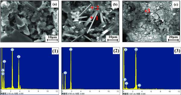 圖2:活性炭和危廢活性炭的SEM圖像和EDS結果。(a)危廢活性炭圖像;(b,c)活性炭圖像(1)CaSO4;(2)的SiO2;(3)KCl。