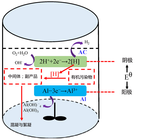 根據(jù)實際工況,提出了一種可行的活性炭載鋁微電解工藝分解水生環(huán)境中有機污染物的反應機理(圖2)。由于其高吸附容量和電導率,活性炭被用作陰極保護。在陽極(鋁廢料),由鋁提供的電子通過微型原電池轉移到陰極(活性炭),吸附在陰極表面的有機污染物受到這些釋放的電子的攻擊。水電離產生的H+在陰極獲得電子并產生具有強化學反應性的活性氫[H]或H2,和活性氫[H]·可以部分降解有機污染物。此外,Al失去三個電子形成鋁離子(Al3+)。然后,鋁離子沉淀形成氫氧化鋁(Al(OH)3、Al(OH)-4等)。作為有利的絮凝劑,這些氫氧化鋁可以有效去除廢水中的有機污染物。難降解污染物在活性炭載鋁微電解工藝的輔助下被分解為小分子中間體,也可以通過氫氧化鋁絮狀污泥的絮凝共沉淀來消除。換言之,與活性炭載鋁微電解工藝相關的許多協(xié)同效應可以有效地分解水環(huán)境中的有機污染物。