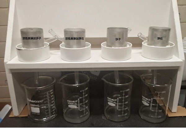 酸二氫鉀在去離子水中制備磷溶液,將活性炭稱重到試管中,,并用36mL的16.3mg/L-1正磷酸鹽平衡,僅包括沙子或浮石樣品。將管在端到端振蕩器上以90min-1的頻率平衡24小時(shí),并通過0.2-μm膜過濾器過濾上清液。根據(jù)鉬酸鹽法,使用UV-VIS分光光度計(jì)分析濾液中的正磷酸鹽。總共16根柱子(直徑7.62厘米,高7.62厘米)用沙子或浮石填充到4.56厘米的深度(圖2)。十六列對(duì)應(yīng)于由兩種過濾器(沙子或浮石)和四種活性炭改進(jìn)材料組成的實(shí)驗(yàn),包括對(duì)照(無添加活性炭),一式兩份。將含活性炭改良劑和不含活性炭改良劑(按重量計(jì)5%)的沙子或浮石混合,然后將其干填充到柱中。每個(gè)柱子的底部都用粗棉布保護(hù),這樣可以大限度地減少過濾材料的損失。