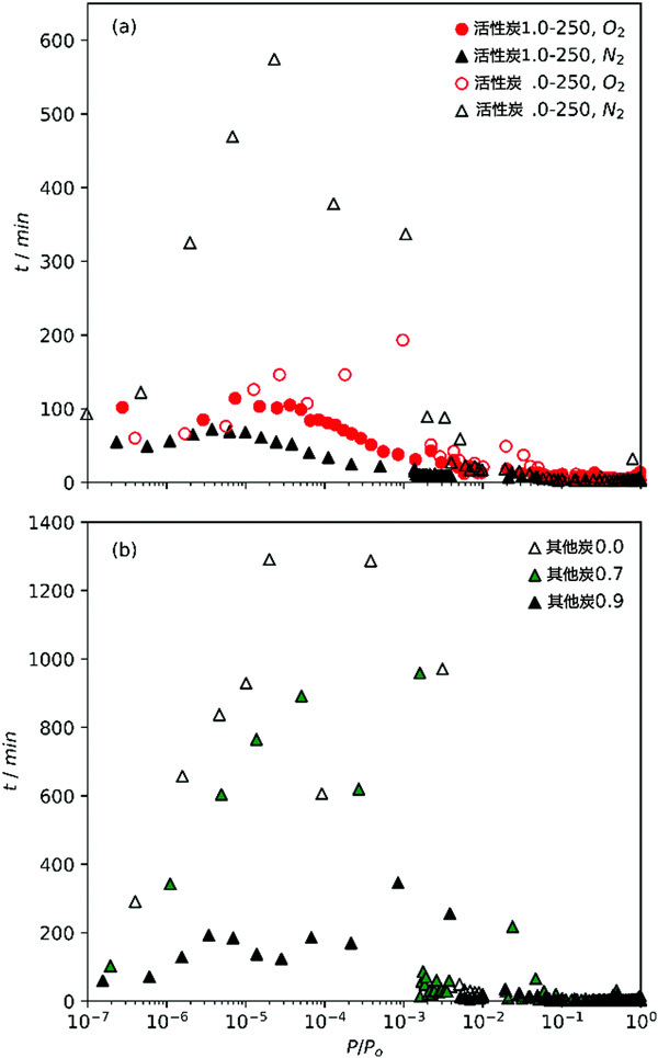 圖1:(a)O2和N2等溫線在活性炭上的相對壓力增加和(b)N2等溫線其他炭的點(diǎn)之間的時間。