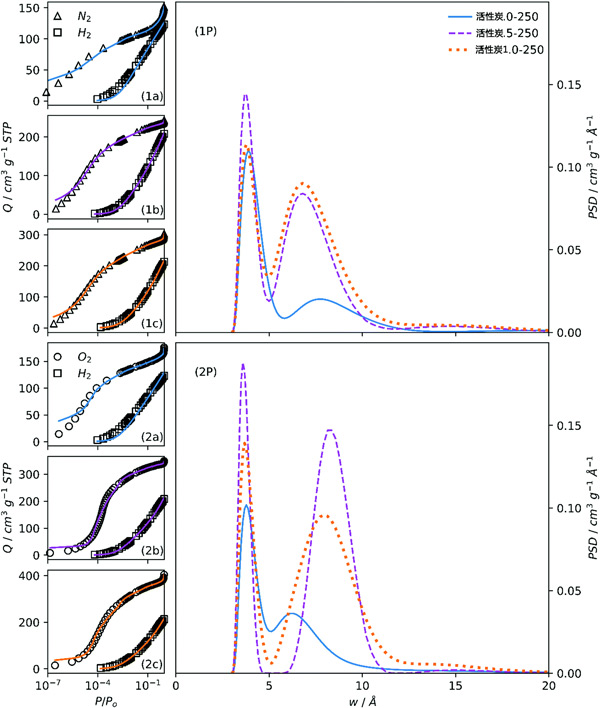 圖2:擬合樣品活性炭的N2/H2(1a,1b,1c)和O2/H2(2a,2b,2c)等溫線和所得的PSD(1P,2P)。