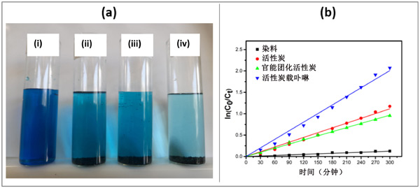 圖3:(a)過濾可見光照射5小時(shí)后MB溶液的照片。(i)單獨(dú)的MB,(ii)MB與活性炭,(iii)MB與官能團(tuán)化活性炭,和(iv)MB與活性炭載卟啉,(b)亞甲藍(lán)降解的動力學(xué)線性模擬曲線。