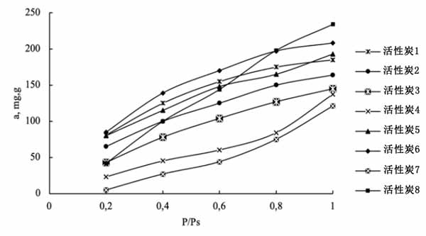 來自植物廢料的活性炭中,活性炭的K值表示吸附劑的吸收能力的最高值,活性炭2的最佳值是由于微孔體積大。表征煤與丁醇相互作用的能量的模型參數(shù)n是活性炭的最小參數(shù)。這對應(yīng)于最凸的吸附等溫線(圖2),這有利于捕獲低濃度的丁醇蒸氣。就活性炭3而言,除活性炭4外,所有活性炭均優(yōu)于活性炭5,與活性炭2相當(dāng)。根據(jù)極限飽和值,由圖1和圖2中的動力學(xué)曲線證明。如圖1所示,繪制了相應(yīng)的吸附等溫線(圖2)。