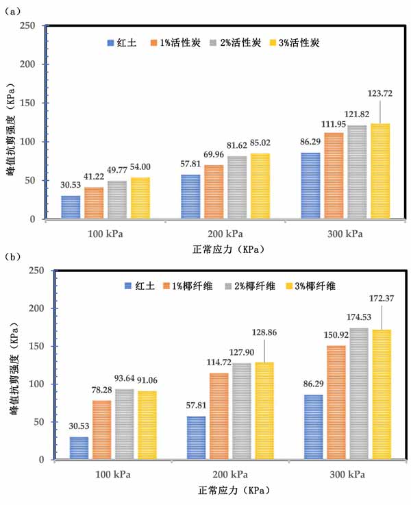 活性炭試樣的剪切強度與剪切應變的關系。峰值剪切強度隨著正應力的增加而提高,特別是300kPa正應力。此外,添加活性炭增加了峰值剪切強度,并且增強率隨著法向應力的增加而增加,如圖4a所示。同樣,添加0.5%的椰殼纖維進一步提高了活性炭穩定土的峰值剪切強度,如圖4b所示。雖然在天然紅土中添加活性炭會增加峰值強度,但對于超過2%的活性炭,增加率并不顯著。例如,活性炭穩定土的峰值強度分別為2%和3%活性炭的121.8kPa和123.72kPa?傮w而言,與本研究的結果相似。發現在石灰穩定土壤中使用椰殼纖維可進一步提高抗拉強度和抗壓強度。還觀察到,椰殼纖維的加入提高了膨脹土中的兩個剪切參數。