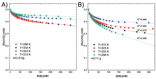 圖2顯示了溶液Re(VII)的初始濃度=0.5mM在不同溫度和活性炭量下的動力學(xué)曲線。圖2A和B顯示了當(dāng)每200cm3溶液分別使用0.5和1g活性炭時的濃度變化。溶液中使用的活性炭量越大,Re(VII)濃度的降低越顯著。這種趨勢歸因于吸附劑的大比表面積,這導(dǎo)致了大容量。碳含量加倍使表面積加倍。