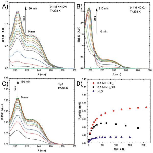 對于解吸研究,在25℃吸附后,200cm3溶液使用1g活性炭。Re(VII)離子的初始濃度為0.5mM。吸附后,將樣品分成三部分。然后在三種環(huán)境中進行解吸,即0.1M/HClO4、0.1M/NH4OH和H2O。在所有情況下,每50cm3液體使用0.3g活性炭。UV-Vis光譜和動力學(xué)曲線如圖4。