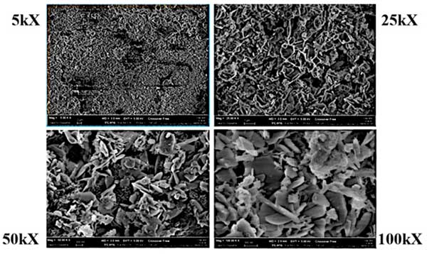 采用掃描電子顯微鏡(SEM)結(jié)合EDS分析來表征吸附劑樣品。局部化學(xué)分析通過EDS(能量色散X射線光譜法)實現(xiàn)。定性分析是通過識別光譜中報告的線來實現(xiàn)的,而定量分析(確定元素組成百分比)是通過測量樣品中存在的每種元素的線強度來進(jìn)行的。圖1顯示了一系列活性炭的SEM圖像,放大倍數(shù)遞增:5000、25,000、50,000、100,000倍。SEM圖像說明了活性炭的多孔結(jié)構(gòu),突出了樣品表面不連續(xù)性的存在。高孔隙率的存在對于限制鼓風(fēng)機(jī)系統(tǒng)過濾沼氣的能量損失是必要的。正如我們之前的一些研究報道的那樣,SEM圖像與EDS分析相結(jié)合可用于突出硫在孔隙和金屬基催化位點內(nèi)的吸附和保留。