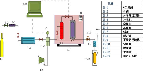 首先,來自儲罐的CO2通過標(biāo)稱尺寸為1µ的過濾器,以避免任何雜質(zhì)進入工藝路徑。然后,CO2被引導(dǎo)至冰箱單元,其溫度降至-10℃和60bar。液化CO2使用往復(fù)泵加壓,并轉(zhuǎn)化為殼管式配置的調(diào)壓鼓。在這個鼓中,流體溫度被設(shè)置為適當(dāng)?shù)臏囟纫赃_(dá)到超臨界流體條件。該鼓的設(shè)計旨在減少波動,熱交換通過使用溫度精度設(shè)置為1K的1000W元件循環(huán)水進行。壓力表安裝在調(diào)壓鼓的輸出端,以顯示出口流體壓力。之后,液體被引導(dǎo)到裝有10克活性炭和玻璃珠的萃取池。在提取單元的輸入和輸出處安裝了兩個孔隙率為1微米的過濾器,以防止顆粒逸出。細(xì)胞中玻璃珠的存在使CO2均勻分布在提取單元內(nèi)。在用SC-CO2加載萃取池后,將萃取池設(shè)置在適當(dāng)?shù)臏囟群蛪毫ο录s45分鐘。在靜態(tài)階段之后,動態(tài)階段從打開采樣閥開始。為了防止閥門凍結(jié),它被包裹在加熱元件中。在動態(tài)時間內(nèi),使用冰柜將樣品采集溫度保持在0℃以下。每個實驗一式三份進行,圖1顯示了超臨界流體裝置的詳細(xì)信息,通過將每個初始活性炭的溶質(zhì)重量除以計算超臨界回收率。
