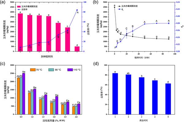 圖1:不同工業(yè)吸附劑(a)、吸附時間(b)、活性炭用量和吸附溫度(c)以及活性炭再生穩(wěn)定性(d)對玉米赤霉烯酮嚴(yán)重污染的玉米油中玉米赤霉烯酮去除的影響。