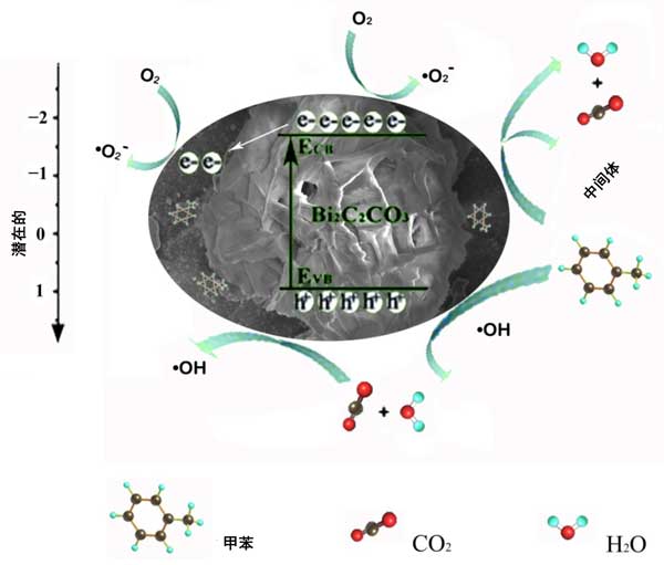 活性炭復(fù)合材料在光照射下降解氣態(tài)甲苯的光催化反應(yīng)機(jī)制可以解釋如下(圖4)。首先,蜂窩狀活性炭基質(zhì)吸附并捕獲甲苯分子。然后,在光照下,電子從價帶(VB)激發(fā)到負(fù)載Bi2O2CO3的活性炭表面的導(dǎo)帶(CB),在VB中留下空穴;钚蕴靠梢猿洚(dāng)電子受體以降低電子-空穴對的復(fù)合率。因此,Bi2O2CO3中CB上的激發(fā)電子可以很容易地轉(zhuǎn)移到活性炭表面,從而促進(jìn)光生電荷載流子的分離和遷移。