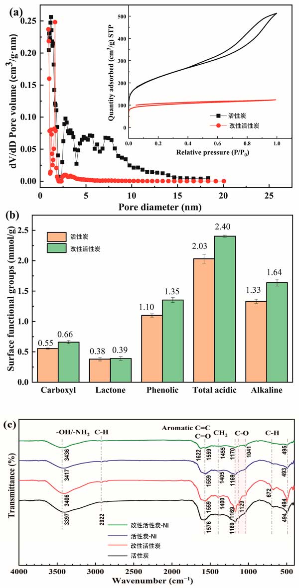 圖1:活性炭和改性活性炭的表征:(a)孔徑分布和氮氣吸附-解吸等溫線;(b)通過Boehm滴定進(jìn)行表面官能團(tuán)分析;(c)Ni(II)吸附前后的FTIR光譜。