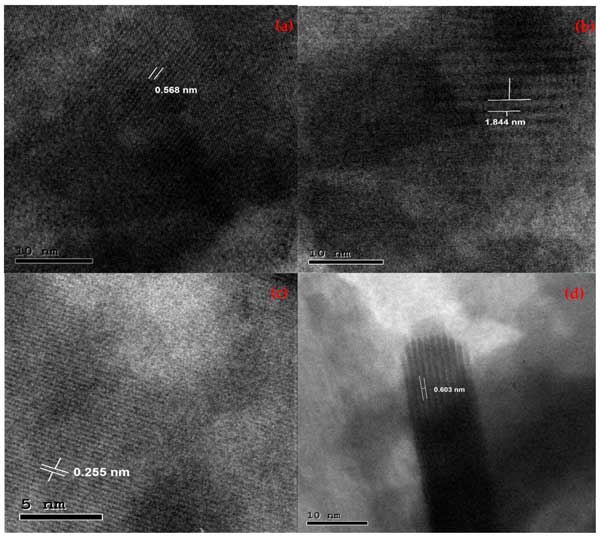圖3:合成的(a)BiOI、(b)1C/BiOI、(c)5C/BiOI和(d)10C/BiOI納米復合材料的HRTEM d間距。