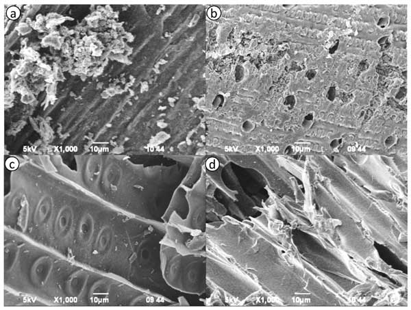 圖1a-d顯示了來自不同植物來源的活性炭樣品的形貌SEM圖像。圖像突出顯示了樣品表面結構和孔隙率的明顯差異。圖1a顯示了粗糙的表面,表面具有高密度的不規則、未受干擾的顆粒。大量裂紋和裂縫的存在表明多孔結構發達。圖1b顯示出類似的多孔形貌,具有廣泛的薄膜狀結構和大空隙,表明活化和孔隙形成效率高。