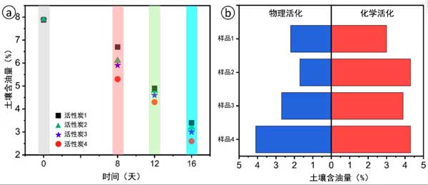 圖2a為污染土壤中油含量的值。土壤初始石油烴污染度為79.2g/kg或7.9wt.%。將活性炭樣品應用于石油污染土壤后,油含量逐漸降低。第8天添加活性炭的土壤樣品油含量為5.7-6.7%,第16天為2.6-3.3%。根據土壤樣品中的油含量計算出土壤凈化度,添加吸附劑的土壤16天后的土壤凈化度為58.2-67.1%。試驗表明,活性炭樣品對土壤表現出較高的凈化效果。16天后,石油污染土壤的凈化度可達67.71%。