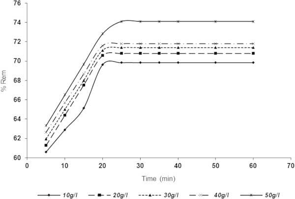 圖、3接觸時(shí)間和不同活性炭劑量對(duì)從BRE(BRE體積= 20ml,C 0 = 161.92mg / l,初始BRE pH,原始溫度= 25℃)中去除SDP%的影響。