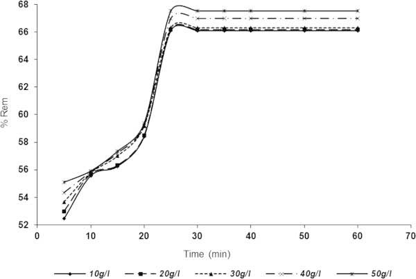 用于吸附除去SDP的相對(duì)于時(shí)間和吸附劑劑量的結(jié)果示于圖2,3在10-50克/升的范圍內(nèi)。圖 5和6表明,SDP去除與在吸附劑用量增加而增加。從圖中可以看出,對(duì)于活性炭1(圖2)和活性炭2(圖 3),平衡時(shí)間為30分鐘后,顆粒截留迅速增加并趨于恒定 。從圖 5中,活性炭1在10g / l時(shí)的去除百分?jǐn)?shù)分別為5和30-60分鐘時(shí)的60.5978和69.8369%。對(duì)于活性炭1(圖 2),分別以50g / l,63.3152和74.1168%記錄5分鐘和(30-60)分鐘。在圖3(活性炭2)中描繪了類似的趨勢(shì), 其中在10g / l劑量下分別在5分鐘和(30-60分鐘)達(dá)到52.4456和66.1005%。對(duì)于50g / l 活性炭2劑量,分別在2和(30-60)分鐘時(shí)達(dá)到55.095和67.527%的去除率。結(jié)果表明,活性炭1在本實(shí)驗(yàn)條件下表現(xiàn)優(yōu)于活性炭2。