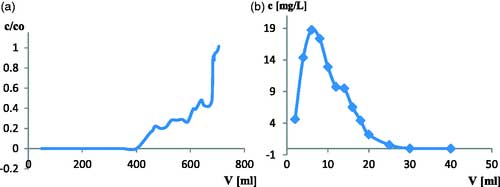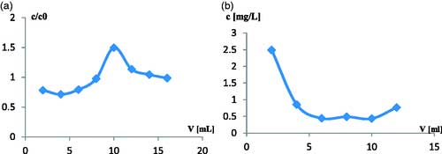 圖2.(a)氧化活性炭上銨離子(NH4+)的SPE(c/c0=f(V))過程中的穿透曲線。(mcar=0.104g ,離子濃度c=NH4+- = 0.661mg/L)。指定每5ml濾液的比例c/c0。(b)經過SPE柱分析每2ml洗脫液后,來自經氧化的活性炭的銨離子解吸曲線(c= f(V))。