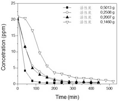 圖1.顯示了質量對活性炭吸附曲線的影響,證明在進行鎳研究時使用較低質量來分析使用該材料可能的吸附容量和飽和時間的變化。