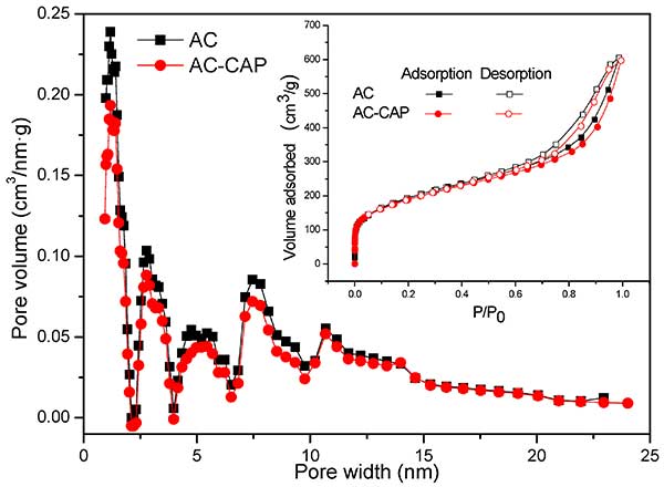 圖1.在氯霉素吸附之前活性炭的分子量 和N 2吸附/解吸等溫線(插入)和氯霉素吸附之后的活性炭。孔徑分布由密度泛函理論(DFT)方法確定。