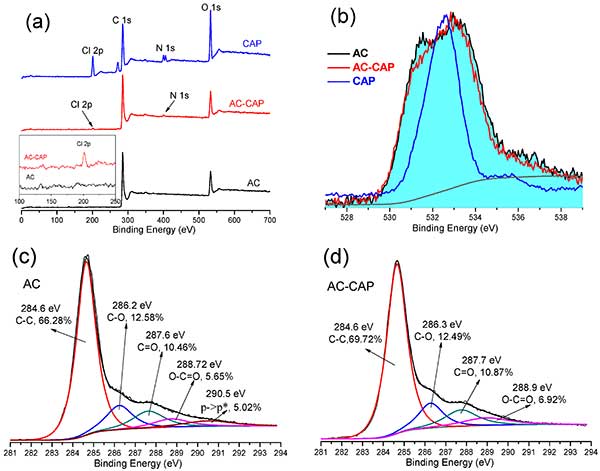 為了進一步了解活性炭吸附氯霉素的機理,用XPS分析活性炭吸附前后的氯霉素(0.3 mmol / L)。圖2中示出了XPS測量光譜,活性炭吸附之前和之后的氯霉素的O 1s和C 1s峰。由C 1s譜確定的表面官能碳原子的計算相對含量也列于圖 2c,d中,并且計算的原子比率總結。主要的C 1s峰符合以下組的五條曲線:286.6eV的石墨結構,286.2eV的CO(苯酚,醇或醚基),287eV的C = O(羰基和醚基),O = 288.7eV處的CO(羧基或酯基),并且在290.5eV處π->π*躍遷。