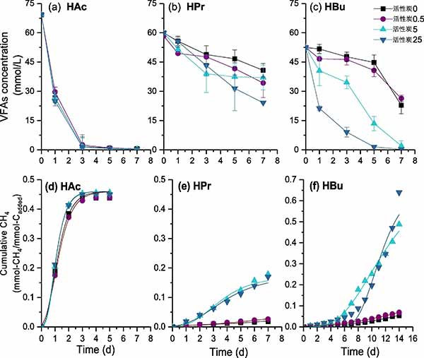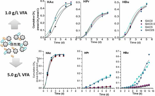 活性炭初始濃度為5g/L時,乙酸馴化培養仍然表現出較高的代謝活性,補充活性炭幾乎不影響甲烷生產率。最終得到甲烷由醋酸約為0.45 mmol-CH4/mmol-Cadded,這是接近在乙酸(例如,1克/升)的低強度而得到的值。但當底物濃度從1g/L增加到5g/L時,丙酸和丁酸的產甲烷轉化率明顯受到抑制。丙酸和丁酸酯反應器的滯后相時間為活性炭0的4.2天和12.7天。這與先前的研究一樣,甲烷生成易受高濃度VFA影響,主要歸因于未解離的VFA對甲烷菌的生長和代謝的抑制。盡管如此,在本研究中加入活性炭顯著加速了丙酸和丁酸的代謝。如圖2所示,當活性炭濃度從0.5g/L增加到25g/L時,丙酸鹽進料反應器的滯后相期從3.4d減少到0.9d,丁酸進料反應器的滯后期從12.7d減少到7.8d。