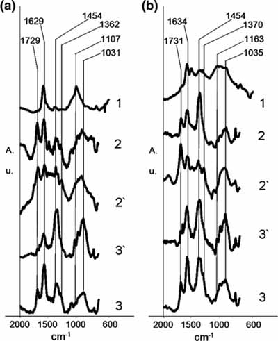 圖2:活性炭-A(a)和活性炭-B(b)的FTIR光譜:初始(1),吸附(2-3)和電化學環化(2',3')從含有4-氯苯氧基乙酸的電解質溶液。