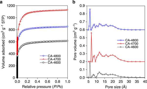 圖1、活性炭的孔隙率。活化的碳被標記為CA-4T,其中4是活化KOH/碳比,T是活化溫度。顯示了氮吸附等溫線(a)和相應的孔徑分布曲線(b)。