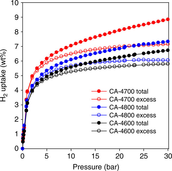活性炭中的氫儲存需要具有最高表面積和適當尺寸的孔的材料。在-196和25℃下使用重量法在HidenXEMIS分析儀上在0-30巴的壓力范圍內研究活性炭的儲氫能力。圖2顯示了活性炭在-196℃下的過量和總氫吸收等溫線。對于所有CA-4T活性炭,氫吸收是可逆的,沒有滯后現象,并且在0-30巴的壓力范圍內沒有達到飽和。我們首先注意到1巴的氫吸收非常令人印象深刻,在3.1-3.9wt%的范圍內。這種儲氫比為高表面積活性炭傾向于在2-3重量%范圍內的任何報告的值高得多。我們將這種特別高的吸收特性歸因于非常高的微孔表面積和富氧表面的組合,特別是對于3.9重量%的活性炭樣品CA-4700。富氧表面的效果是對于活性炭樣品CA-4600,其盡管具有適度總表面積和微孔表面,仍然表現出的吸收比以前發現的活性炭材料具有高得多的表面積。經過研究發現,具有氧官能團的活性炭效果預期在低壓下具有最大效果,其中氫和表面之間的相互作用比在較高壓力下更重要,其中通過空間填充機制更可能發生氫吸收。