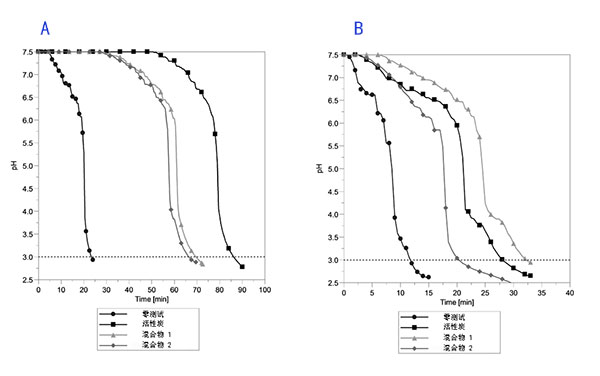 圖1a顯示了在上述的試驗(yàn)結(jié)果。可以看出,在22分鐘后,氣體洗滌瓶中的pH值降至3以下,而在反應(yīng)器中不使用活性炭吸附劑樣品。用活化的氧化鋁樣品裝載反應(yīng)器分別產(chǎn)生66和71分鐘的穿透時(shí)間。用浸漬的活性炭實(shí)現(xiàn)了最佳性能,即氯化氫吸附容量為0.0288g/g。將氣體流速提高所取得的結(jié)果如圖1b所示。要進(jìn)行的第一次試驗(yàn)是在反應(yīng)器中沒(méi)有活性炭吸附劑負(fù)載,并且在12分鐘后氣體洗滌瓶中去離子水的pH值降至3以下。對(duì)于浸漬的活性炭,氯化氫吸附容量從0.0288g/g降低至0.0172g/g。