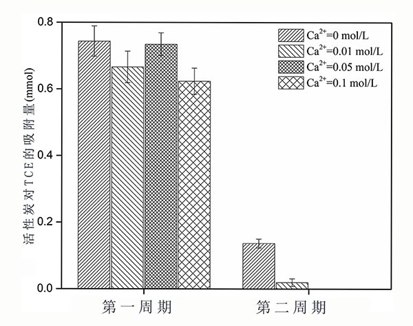 如圖2所示,進行了兩次吸附/再生循環。在第一次吸附/再生循環期間,當鈣離子存在時,TCE去除明顯減少。顯然,在第二次吸附/再生循環期間,即使進行活性炭的再生,也難以在鈣離子條件下除去TCE。這表明鈣離子不僅在活性炭的吸附能力,而且在其再生過程中都起著重要作用。原因可能是由于鈣離子與其他離子的結合,導致其容易在活性炭表面上沉淀并影響其吸附能力,導致第二循環中TCE去除的減少。