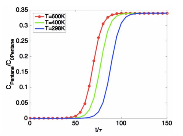 結果與討論我們已經提出了一個綜合模型,該模型定量地預測了填充床反應器中油蒸氣回收的吸附動力學。在該模型中,我們僅考慮軸向擴散,并使用質量守恒方程來模擬油氣吸附的時空分布。我們假設活性炭吸附在恒溫下操作,并且與活性炭的吸附容量相比,油蒸氣濃度非常低。此外,假設油蒸氣中的組分之間不發生化學反應,因此每種組分可以作為獨立的吸附物處理。因此,多組分吸附問題可以轉化為單組分吸附問題。下圖(圖2)說明了吸附動力學的溫度依賴性。