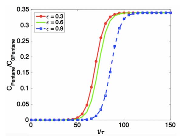 模擬三種不同孔隙率的活性炭的吸附動力學(圖2)。通過多組分加權平均計算C/C0(我們模擬每種組分的吸附動力學,計算它們相應的穿透曲線,并根據它們在原始油蒸氣中的體積分數得出加權平均值)。從圖3中可以看出,較高的孔隙率可以在較長的穿透時間內重新產生,這與較高的孔隙率將導致較高的表面積并且將使反應器中的吸附物的停留時間更長的事實一致。