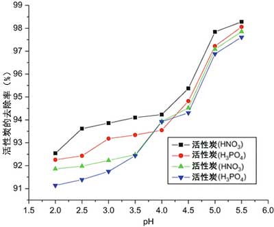 圖4:pH對(duì)活性炭去除百分比的影響。