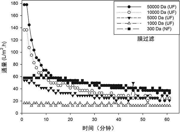 在膜過濾測試中,使用四個UF膜和一個NF膜。研究了1小時的通量變化,并監測了降低的通量。在UF膜觀察到較高的通量降低。過濾1小時后,隨著截留分子量從50,000 Da減少到1,000 Da,通量下降也減少了。對于10,000 Da UF膜,在初始通量1小時過濾后損失了82%的通量。1,000 Da UF膜顯示出較低的通量在圖2顯示。孔徑是影響膜過濾通量的最重要參數之一,也是影響活性炭吸附能力的參數。通量也受膜結構,水中成分和廢水pH的影響。有些膜有很高的同量主要是由于膜表面與廢水成分之間的靜電相互作用。