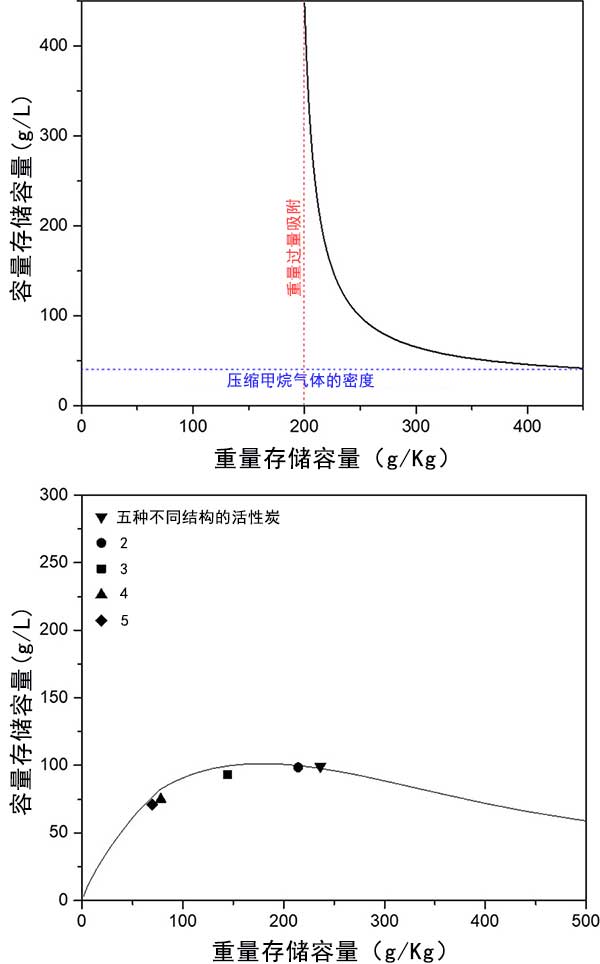 圖4:活性炭的體積和重量存儲容量在相同條件下之間的相互依賴性。
