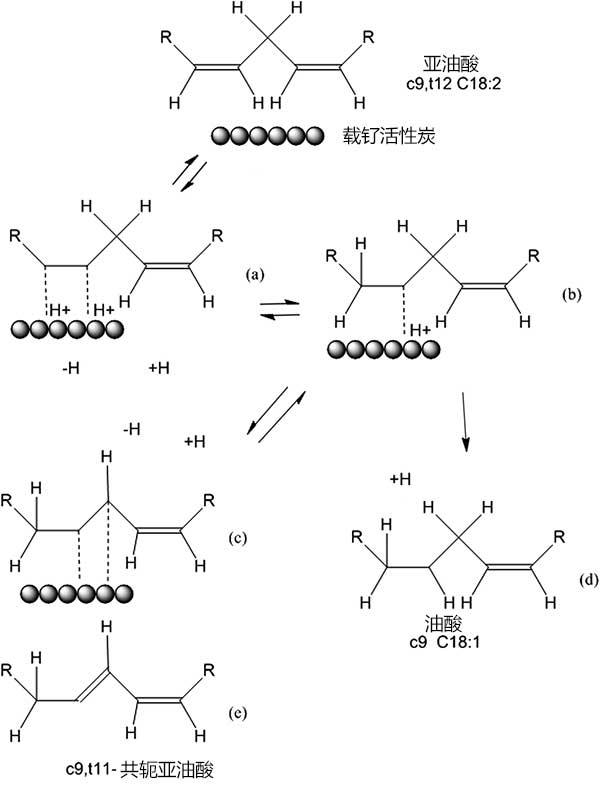 我們選擇兩種典型的商用催化劑(Ru/Al 2 O 3和Ru/C)來異構化棉籽油用于比較。在相同條件下選擇165℃作為反應溫度,并使用800rpm的攪拌速率以確保催化劑均勻地分散在基材中。根據反饋的數據得知,六種載釕活性炭催化劑的棉籽油中亞油酸的轉化率為7.93%至37.66%,六種活性炭催化劑的總共軛亞油酸產率為2.25%至15.91%。已知載體材料的性質和金屬的氧化還原態會影響化學吸附并影響金屬催化劑的催化性能。根據結果所有載釕活性炭表現出比兩種商用催化劑更好的催化性能,這可以促進金屬與載體相互作用。亞油酸到共軛亞油酸的異構化過程可以用一種機理來解釋,該機理描述了烯烴的氫化和異構化。如圖4所示,有幾個步驟:(a)亞油酸化學吸附在釕表面上。(b)氫原子從釕表面解吸,形成半氫化中間體。(c)飽和鍵的形成或(d)相鄰氫的抽取,導致形成二吸附的絡合物。(e)幾何和/或位置異構體的解吸附。當釕表面上吸附的氫高時,將發生半氫化中間體的氫化(步驟(c)。在本次研究中,催化劑未被氫預活化使釕表面上吸附的氫氣較低,使反應趨于異構化而不是氫化。此外,由于活性炭的電子給體性質,釕納米顆粒與活性炭之間存在金屬與載體的相互作用,其阻止釕的再氧化并增加亞油酸和釕接觸的機會以獲得更好的綴合結果。這可用于解釋為什么所有載釕活性炭都表現出比商用催化劑更好的催化性能。
