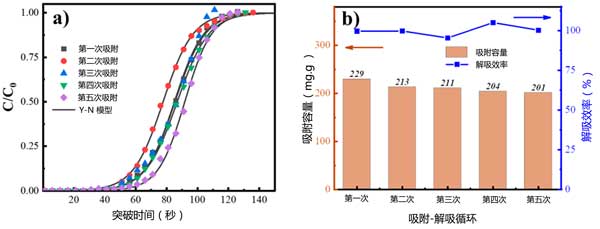 圖5:(a)循環(huán)實驗期間的突破曲線。(b)吸附容量和解吸效率。