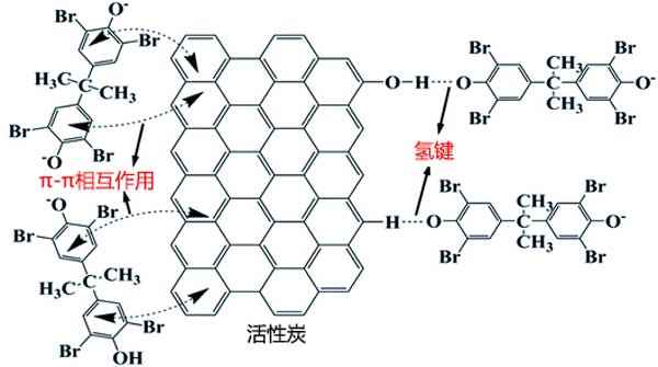 根據先前研究的多種吸附動力,包括靜電相互作用,氫鍵,π-π相互作用,疏水效應等;谶@些結果,進一步提出了四溴雙酚A在活性炭表面上的可能吸附過程(圖4)。由此可以推斷,由于苯環和活性炭表面上的-OH基團,π-π相互作用可能在吸附過程中起重要作用,因為給電子官能團可能增強四溴雙酚A芳環的π-給體強度。氫鍵也對吸附產生顯著影響,活性炭可作為氫鍵供體,依賴于-OH基團和表面上的芳環,產生更好的吸附能力。此外,根據動力學模型分析的結果,吸附劑和吸附物之間可能存在電子交換或共價鍵。