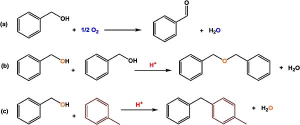 圖1所示,對于我們的銠活性炭催化劑,如果在布朗斯臺德酸中心存在下,芐醇氧化成苯甲醛可能發生平行反應:(a)苯甲醇氧化成苯甲醛(不需要酸中心)和副產物形成水。(b)兩分子芐醇縮合形成一分子二芐基醚,并除去水分子。(c)芐基化反應,包括從芐醇向甲苯分子中加入芐基碳陽離子(未顯示),并除去水分子以形成甲基-二苯基甲烷異構體等。