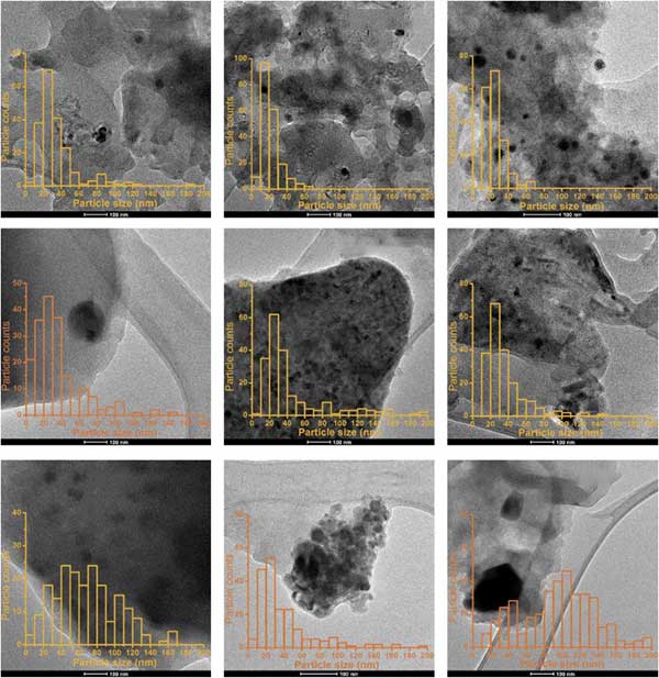 粒徑的變化在許多催化應用中是至關重要的,并且使用硝酸的原理正是為了誘導這些變化。為了通過實驗驗證該假設,對于所有九種載銠活性炭催化劑,通過TEM系統地評估Rh納米顆粒的粒度和分布。