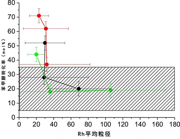 很明顯,這些粒徑范圍非常寬,我們認為考慮這樣的大顆粒對氧化反應具有活性是不現實的。在其它術語中,因子或參數是該預治療效果有在銠粒子的大小,但另外一個因素或參數是在銠粒徑變動的影響對催化活性。圖3值得注意的是,對于高于約的顆粒。30-40nm不再觀察到與催化轉化的變化或相關性,表明粒度不再是活性參數。我們認為該值是銠對芐醇氧化的活性的近似上限直徑,或者反過來對該反應有活性要求小于約30納米。我們認為這個結論雖然是一個廣泛的估計,但與未來基于這種金屬的催化劑開發相關。