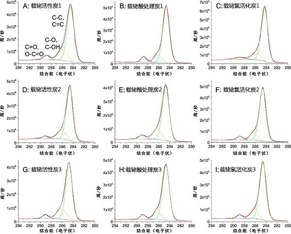 在我們的案例中,我們對所有9種活性炭催化劑進行了詳細的X射線光電子能譜分析。但是,我們應該注意到,就表面原子組成而言,沒有檢測到信號。我們將此結果歸因于銠的固有低信號,并且我們的銠中心極其分散在我們的碳基質中,反過來非常低的暴露金屬部分用于有意義的檢測,X射線粉末衍射儀分析也證實了這一點。