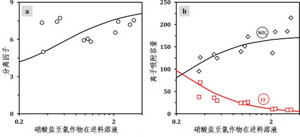 圖2a和圖2b顯示了平衡電吸附數據分離因子沒有和離子吸附容量作為的函數硝酸鹽至氯化物溶液中的濃度比。我們觀察到了平衡電吸附數據與離子吸附容量一起增加硝酸鹽至氯化物進料溶液中的濃度比。在圖2b中,我們看到隨著初始增加硝酸鹽至氯化物氯-濃度比,濃度之差硝酸鹽和氯化物在微孔中增加。然而,在達到平衡之前,優先離子電吸附由初始濃度比確定:溶液中具有最高濃度的離子主要是電吸附的。