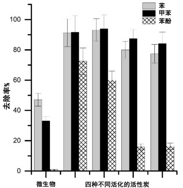 簡而言之,使用活性炭(60%-93%)和載微生物活性炭(16%-84%)比游離的無活性炭載體的微生物(1%-47%)更好地去除芳香烴。材料的孔隙率和吸附偶極性有利于吸附。常規(guī)活性炭表現(xiàn)出高度的微孔性,其中可以容納分子量約為100的苯,甲苯和苯酚;钚蕴康姆菢O性特征保證了碳?xì)浠衔锏氖杷,也是非極性的。活性炭陽離子表面有利于芳烴保留,因為芳環(huán)中的π電子與表面陽離子靜電連接。使用常規(guī)活性炭和載微生物活性炭的原油去除能力如圖3所示。使用游離的微生物和油-鹽水乳液作為對照。