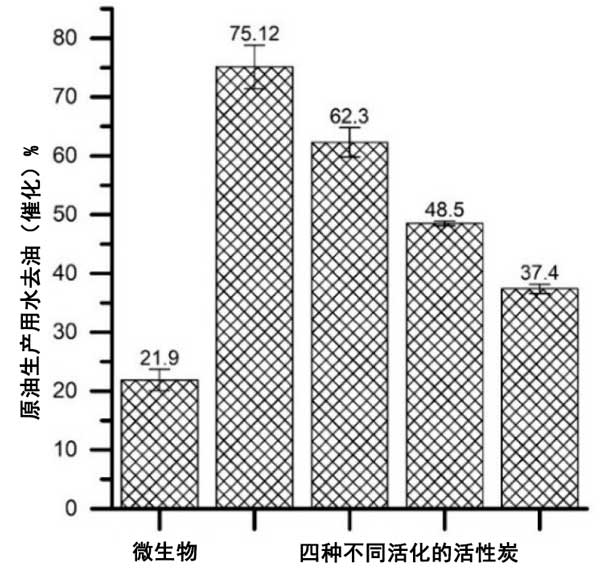 分別使用微生物和四種活性炭24小時后,油-鹽水乳液中去除的原油總量分別為21.9%,75.1%,62.3%,48.5%和37.4%。通常,常規(guī)活性炭去除了比活性炭載微生物材料更高量的原油。這可能是由于吸附對的高物理化學(xué)親和力,可以通過范德瓦爾斯相互作用來控制。活性炭的高孔隙率有益于原油組分的物理吸附。去除基礎(chǔ)材料和載微生物材料之間的差異在于不同量的可用活性位點,其在微生物材料中較少,因為微生物沉積在孔中。通過考慮活性炭以更大比例固定微生物并呈現(xiàn)更好的多孔性質(zhì)來解釋這些發(fā)現(xiàn)。