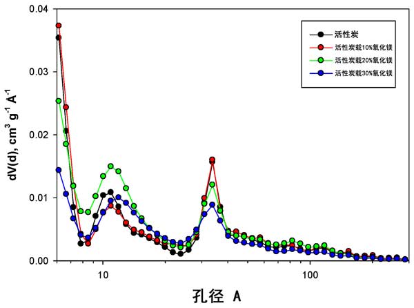初步的TG分析20%氧化鎂負載量的活性炭與釋放的氣體進行IR分析表明,硝酸鹽的分解在400°C以下完成。在此溫度以上,僅發生了Mg(OH)2緩慢轉變為MgO的情況。因此,所有在600°C下處理過的催化劑均由分散在活性炭上的MgO組成,而沒有硝酸鹽前體鹽的殘留。圖1報告了不同負載下的活性炭和負載了氧化鎂的活性炭催化劑的孔徑分布(PSD)。