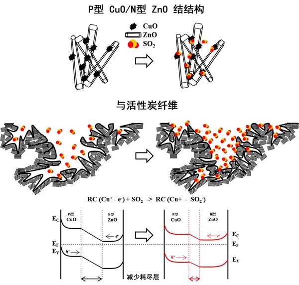 在圖3中,CuO顆粒隨機分散在ZnO花表面上。當(dāng)CuO顆粒與ZnO花結(jié)合時,在p型CuO顆粒和n型ZnO花之間的界面處形成p/n結(jié)。在這種機制下,電子從n型ZnO轉(zhuǎn)移到p型CuO,并且空穴通過p型CuO到達n型ZnO,直到在系統(tǒng)中建立均勻的費米能級,從而導(dǎo)致能帶在耗盡層彎曲。然而,當(dāng)CuO-ZnO組合結(jié)構(gòu)暴露于SO 2時,電子通過Cu +之間的氣敏反應(yīng)釋放和SO帶負(fù)電的2 -離子。還原的SO 2分子與CuO中的孔結(jié)合,從而減少了耗盡層和電阻。這種現(xiàn)象可通過降低電阻來實現(xiàn)良好的SO 2檢測。因此,p型CuO和n型ZnO的傳感響應(yīng)的貢獻代表了傳感器的主要特性,而活性炭纖維的比表面積在SO 2傳感特性中起著重要的作用。